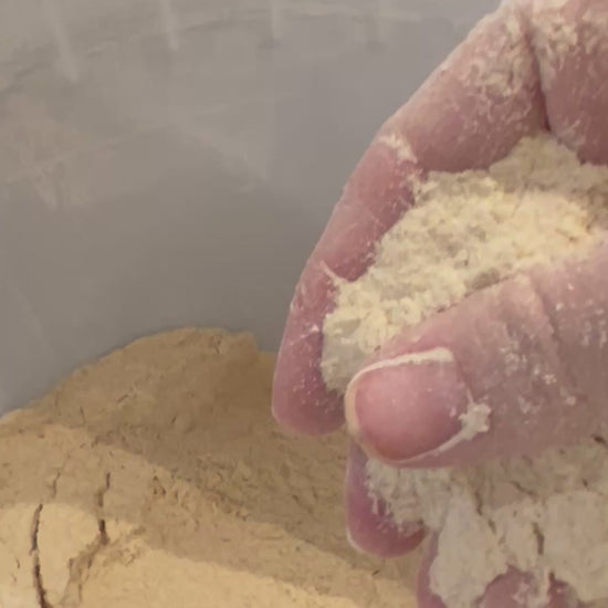 Milled twice on our traditional stone mill, then lightly sifted, this flour is exceptionally fine, soft, and fluffy. The process removes only the coarsest bran while preserving the germ, natural oils, and fine bran, resulting in a whole-grain flour that hydrates evenly and behaves beautifully in dough.