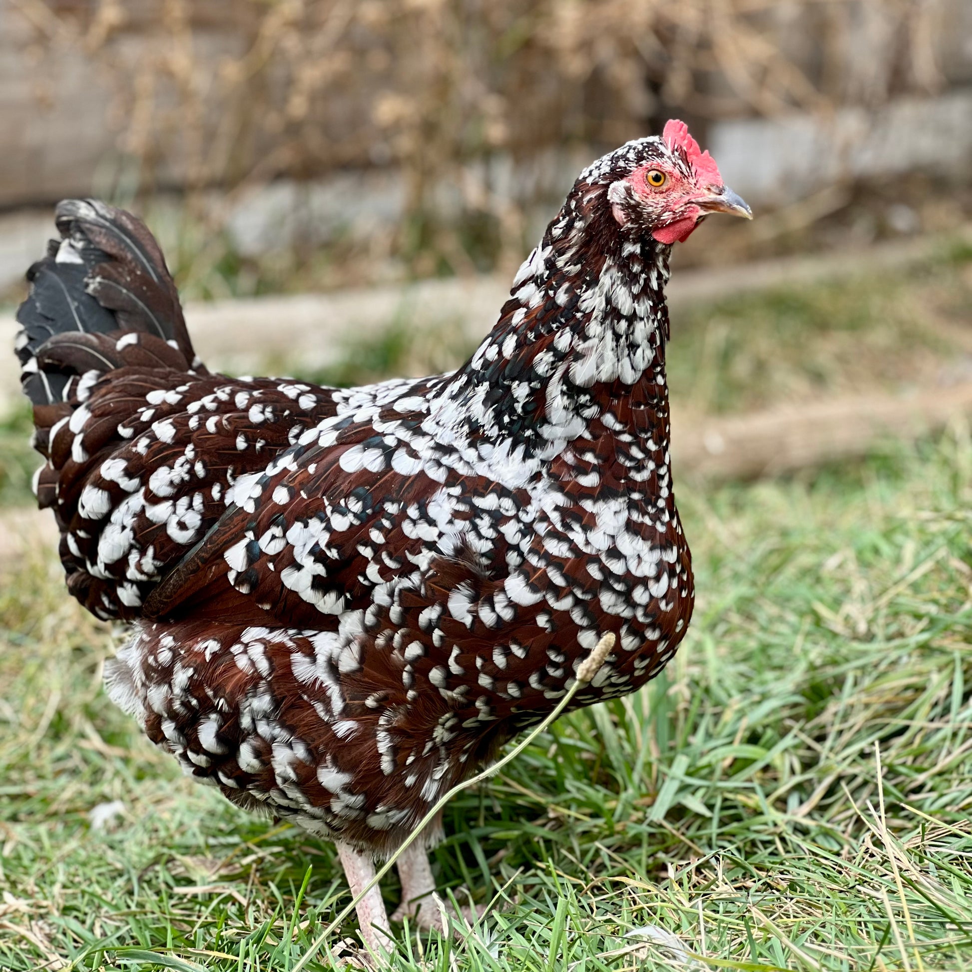 Originally from England, the Speckled Sussex is a heritage dual-purpose breed valued for its easygoing nature, consistent laying, and gorgeous plumage. Their feathers are a rich mahogany brown dusted with white speckles, which become even more pronounced with each molt. Every bird is uniquely patterned — no two are the same.